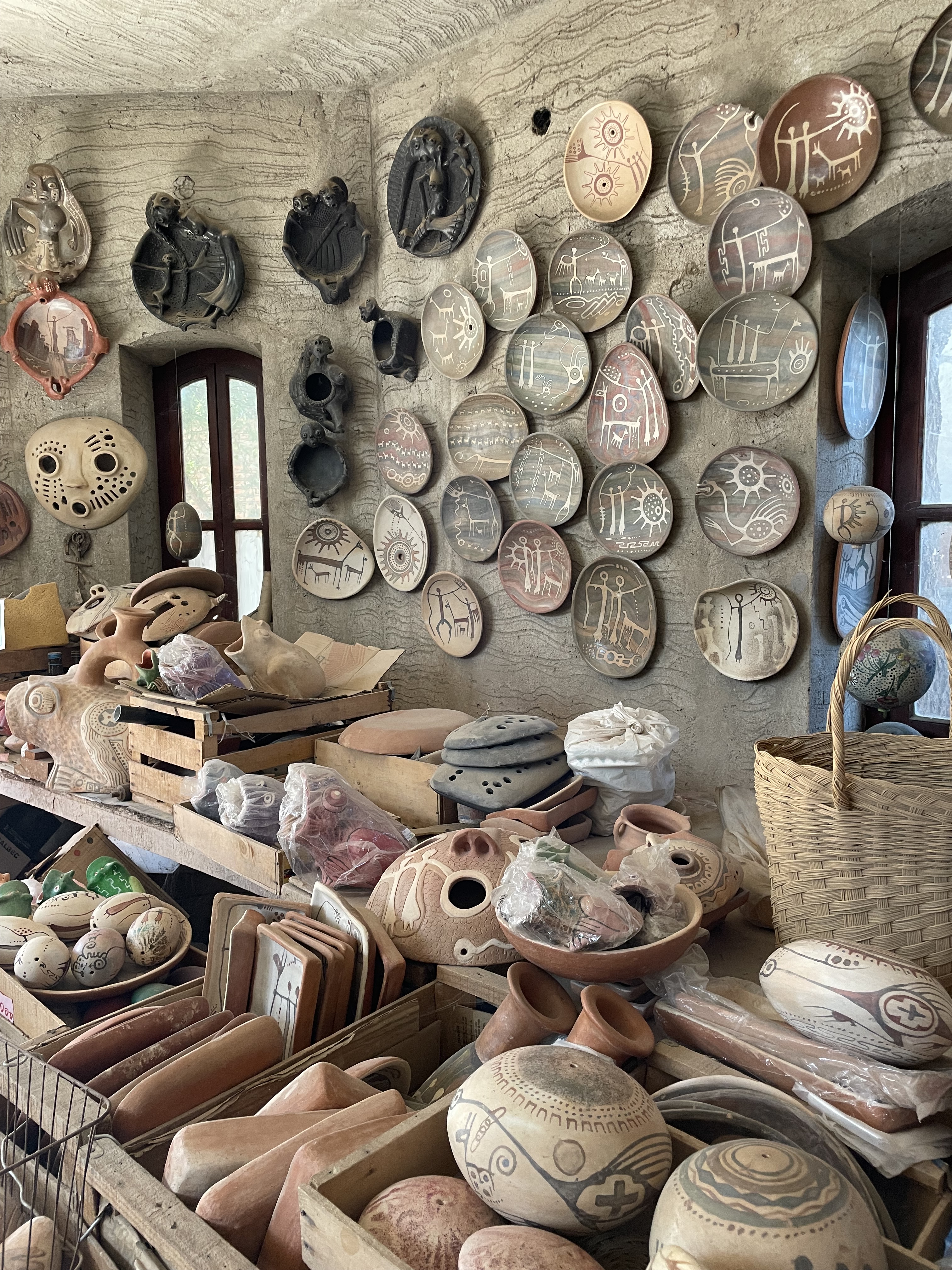 Manuel designed and built his home 40 years ago (photo at bottom of page). He and his wife live upstairs, and the lower floor is dedicated to his creative endeavours. Apart from a small walkway, every available space on both the floor and walls showcase his work: pottery of all shapes and sizes, each individually hand-painted. Upon first walking into his home, you are initially taken aback by the sheer scale of it. There are THOUSANDS and they are all unique. Then you notice him, to the right, tucked away in his artist’s nook working on yet another piece. You will also notice the giant cobwebs, one directly behind him, which he said are very effective for repelling mosquitos.